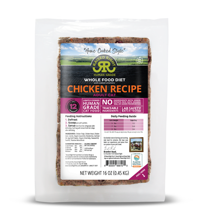 Our Chicken Adult Cat Recipe is formulated to meet the nutritional levels established by the AAFCO Cat Food Nutrient Profiles for maintenance. Calorie content (ME Calculated): 368 kcals / cup (1,628 kcals / kg)