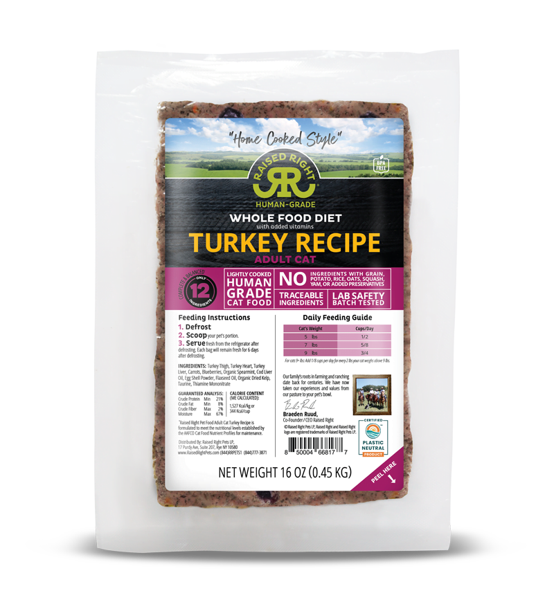 Our Turkey Adult Cat Recipe is formulated to meet the nutritional levels established by the AAFCO Cat Food Nutrient Profiles for maintenance. Calorie content (ME Calculated): 344 kcals / cup (1,527 kcals / kg)