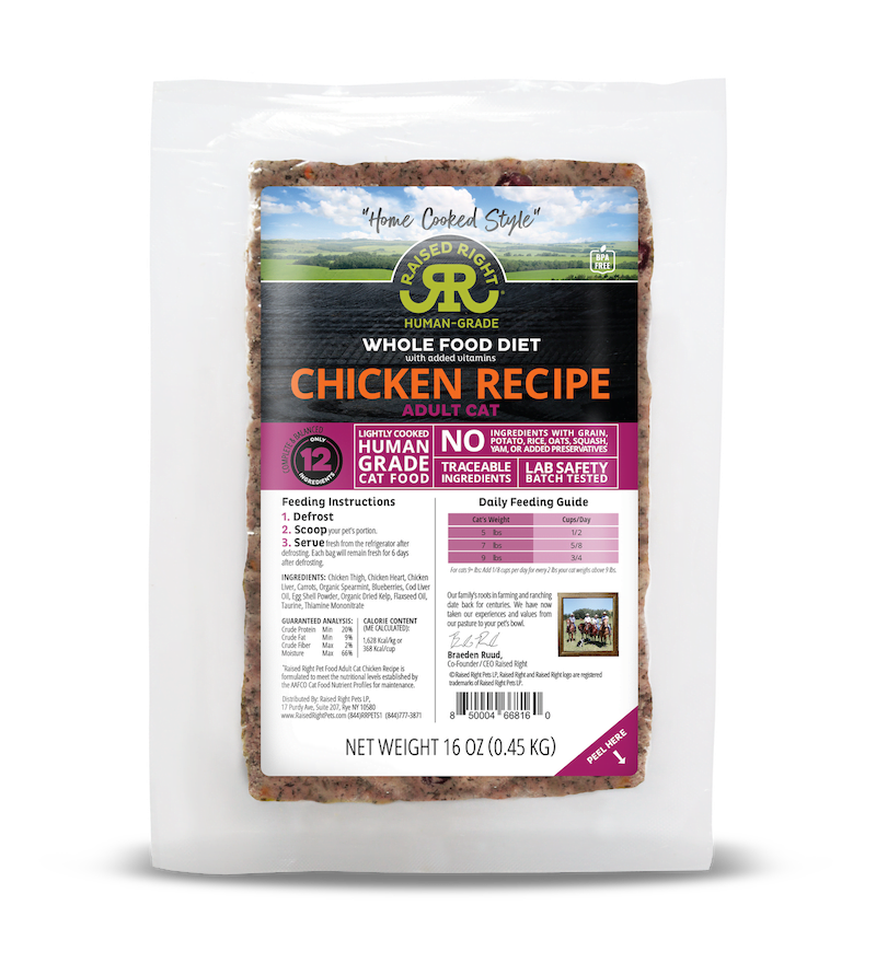 Our Chicken Adult Cat Recipe is formulated to meet the nutritional levels established by the AAFCO Cat Food Nutrient Profiles for maintenance. Calorie content (ME Calculated): 368 kcals / cup (1,628 kcals / kg)