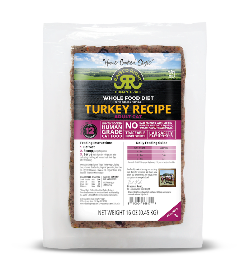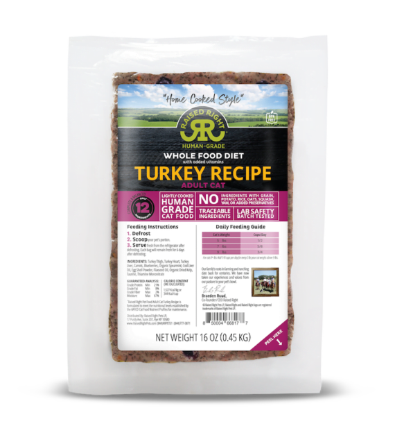 Our Turkey Adult Cat Recipe is formulated to meet the nutritional levels established by the AAFCO Cat Food Nutrient Profiles for maintenance. Calorie content (ME Calculated): 344 kcals / cup (1,527 kcals / kg)