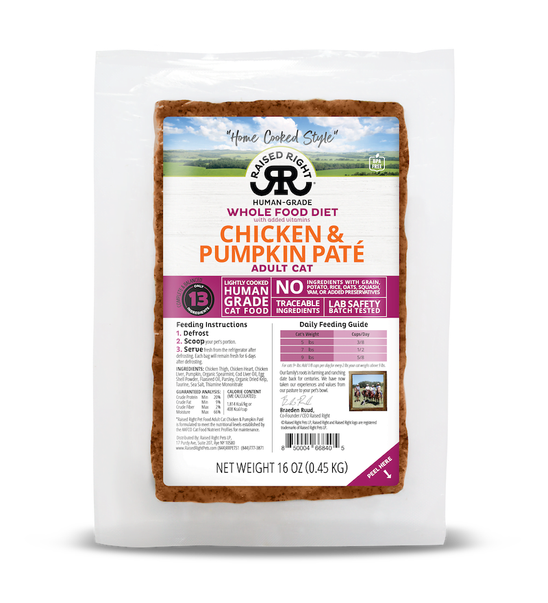 Our Chicken & Pumpkin Paté for Adult Cats is formulated to meet the nutritional levels established by the AAFCO Cat Food Nutrient Profiles for maintenance. Calorie content (ME Calculated): 408 kcals / cup (1,814 kcals / kg)