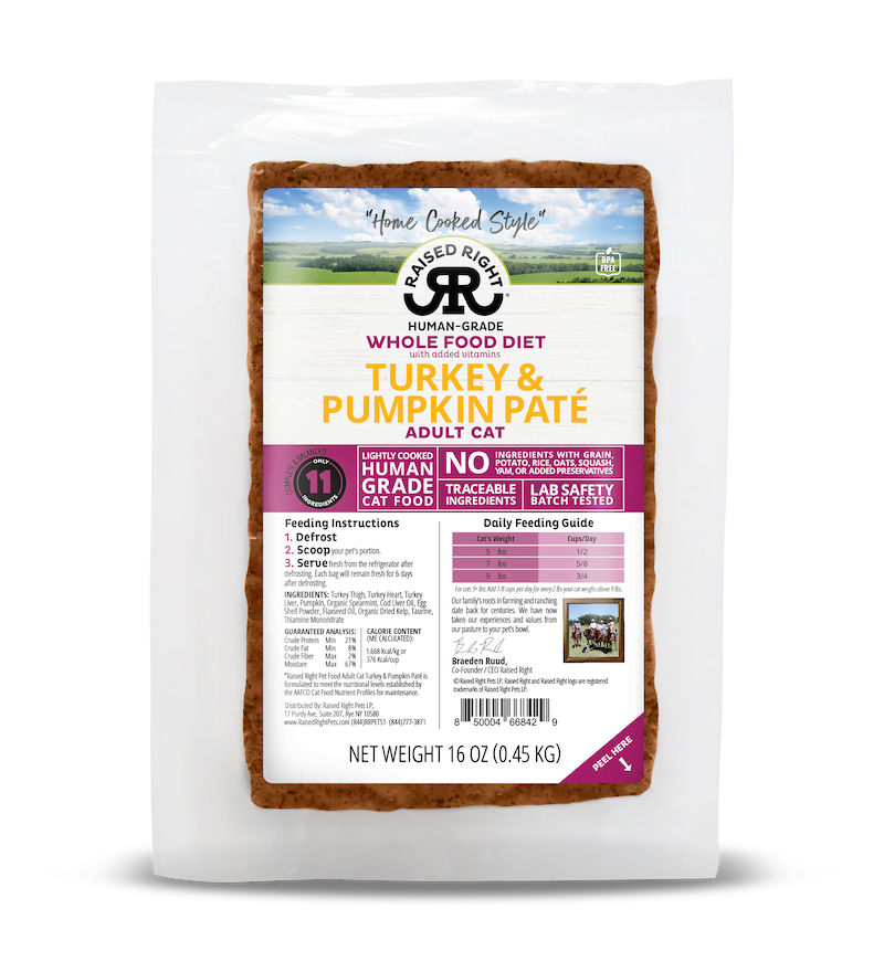 Our Turkey & Pumpkin Paté for Adult Cats is formulated to meet the nutritional levels established by the AAFCO Cat Food Nutrient Profiles for maintenance. Calorie content (ME Calculated): 376 kcals / cup (1,668 kcals / kg)