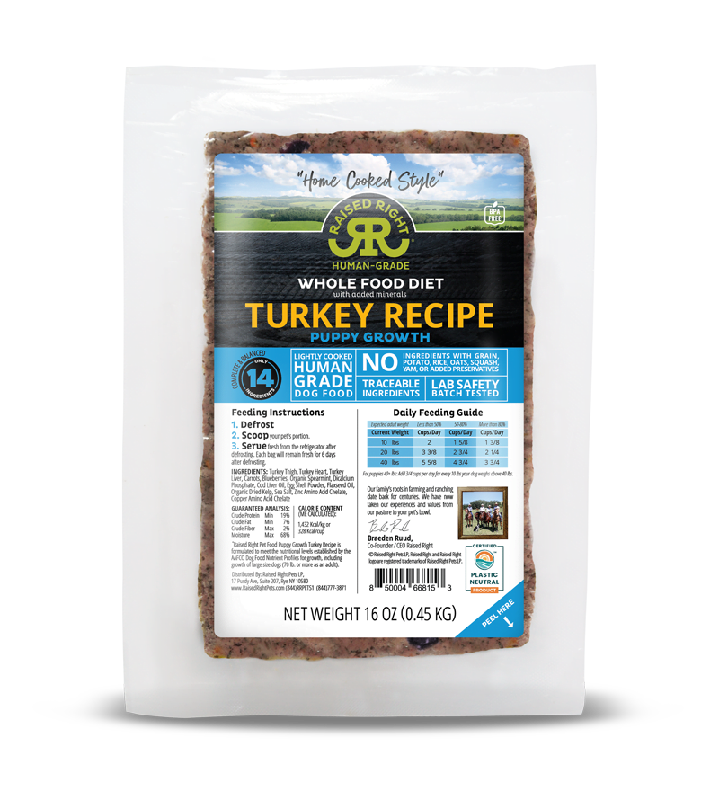 Turkey Thigh, Pumpkin, Turkey Heart, Turkey Liver, Organic Spearmint, Cod Liver Oil, Egg Shell Powder, Flaxseed Oil, Organic Dried Kelp