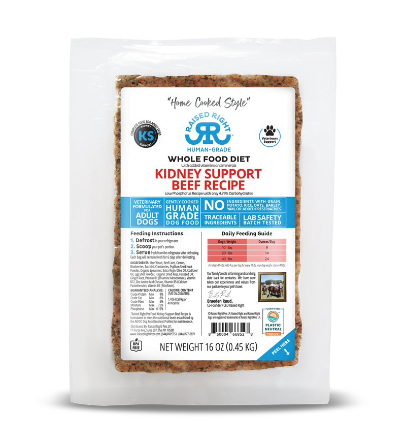Our Kidney Support Beef Adult Dog Recipe is formulated to meet the nutritional levels established by the AAFCO Dog Food Nutrient Profiles for maintenance. Calorie content (ME Calculated): 40 kcal / oz (1,406 kcal / kg)